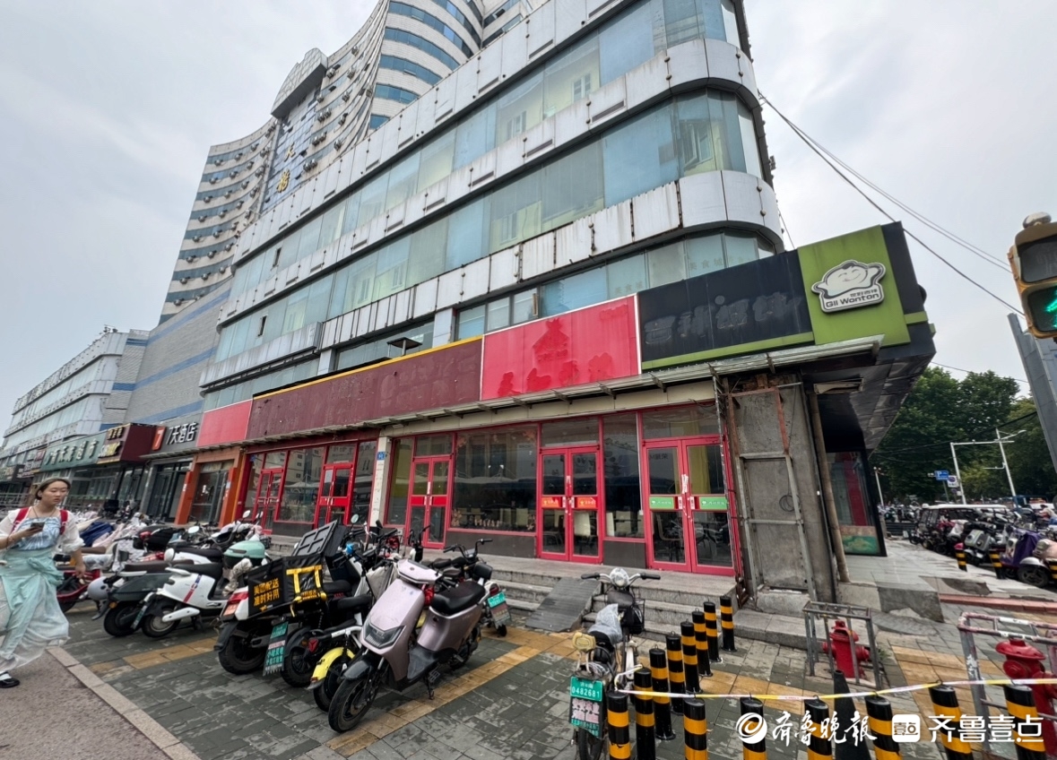 记者在现场看到,大厦分为底层商户区和楼上办公区,底层商铺以超市、快餐店和快捷酒店居多。目前,大厦北侧和西侧的一楼底商基本搬迁完毕,门前匾额的字牌也已经拆除,东侧还有几家商户正在营业。天龙大厦东侧的一家银行已搬离,门上贴有“济南铁道大酒店封”字样白色封条,贴封日期显示是“二零二四年一月二十六”。