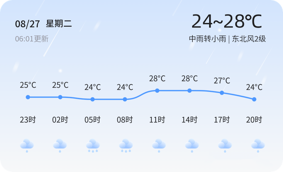 2024年8月27日,农历七月廿四,淄博今日天气以中雨开场,随后转为小雨,全市各区普遍迎来降水,气温在24℃至28℃之间徘徊,东北风2级,湿度高达95%,空气质量良好,PM2.5指数为33。雨中淄博,虽带凉意,却也增添了几分湿润与宁静。