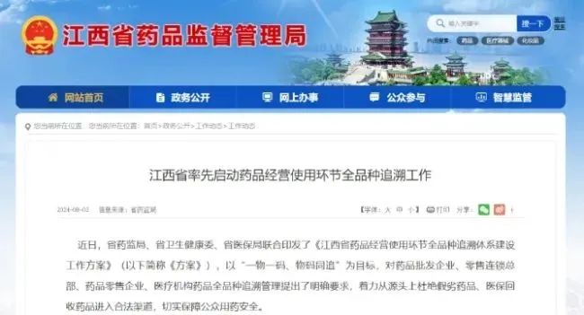 近日,江西省药监局、江西省卫生健康委、江西省医保局联合印发了《江西省药品经营使用环节全品种追溯体系建设工作方案》(以下简称《方案》),重在推广“一物一码、物码同追”的新药品追溯体系。