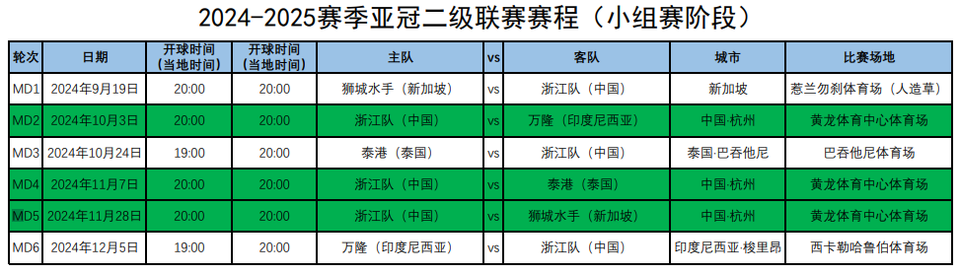 亚冠二级联赛小组赛阶段,每支球队需进行三场比赛,且均在今年进行。浙江队将先后迎战万隆、泰港和狮城水手。