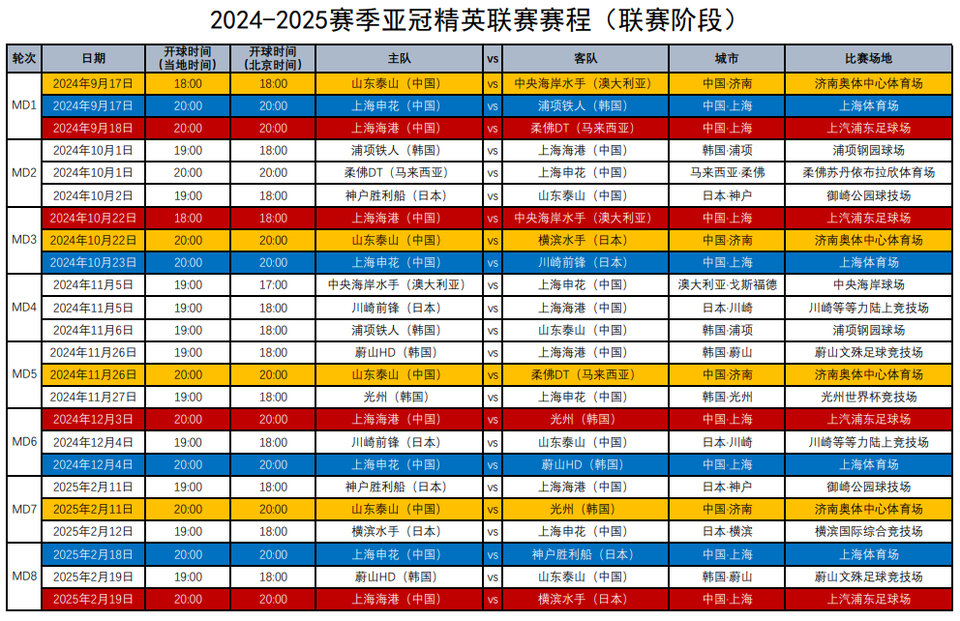 公告中,中国足协发布2024-2025赛季亚冠精英联赛具体赛程(联赛阶段),以及亚冠二级联赛赛程(小组赛阶段)。其中,山东泰山队最先擂响战鼓,9月17日18:00在主场迎战中央海岸水手。