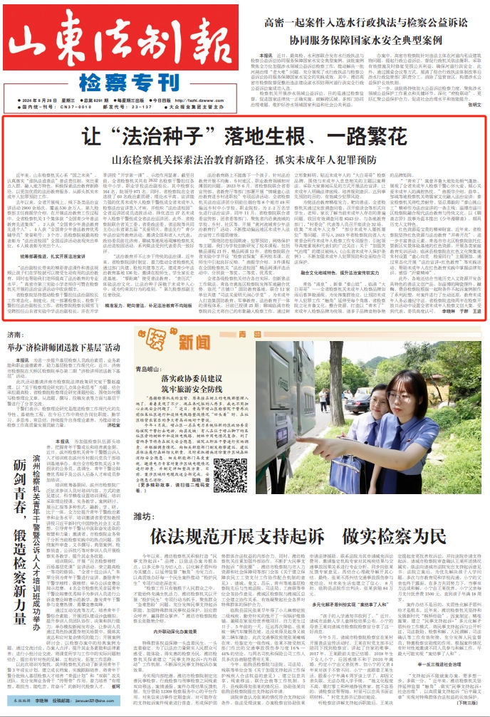 近年来,山东检察机关心系“国之未来”,认真落实“谁执法谁普法”普法责任制,突出重点人群,融入地方特色,积极探索法治教育新路径,以更加优质的法治教育服务,从源头抓实未成年人犯罪预防工作。