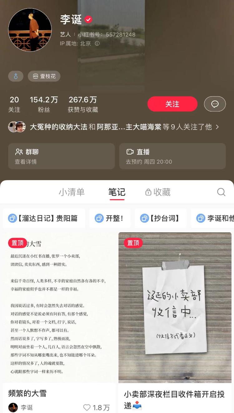 不论是出于主动选择还是外界因素的影响,李诞正逐渐从脱口秀舞台的中心位置淡出,转而展现出对深耕“网红”身份的浓厚兴趣。观察其小红书平台的首页信息,不难发现李诞已签约至杨天真麾下的MCN机构——壹枝花。