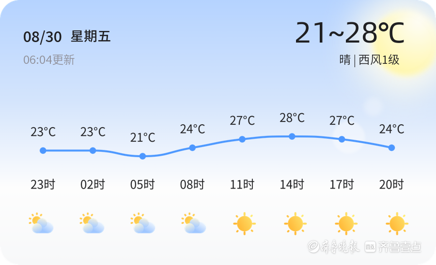 今天是2024年8月30日,农历七月廿七,威海市迎来了晴朗明媚的一天。全市各区普遍天气晴朗,气温适宜,最低气温21℃,最高气温攀升至28℃,西风轻拂,仅1级,空气质量优,PM2.5指数仅为25,相对湿度高达89%,为市民们提供了一个舒适的户外环境。