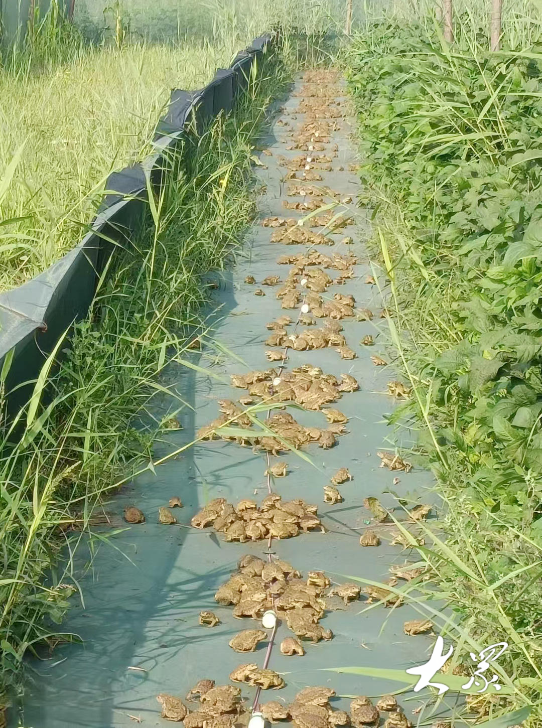 永兴新村村西南有一片荒地,2024年3月整理出2亩多地,用绳网围起来,便成了蟾蜍养殖基地。春风吹暖春水时,合作公司先后两次送来40万只黑色的小蝌蚪。小蝌蚪养在基地新建起的大水池子里。