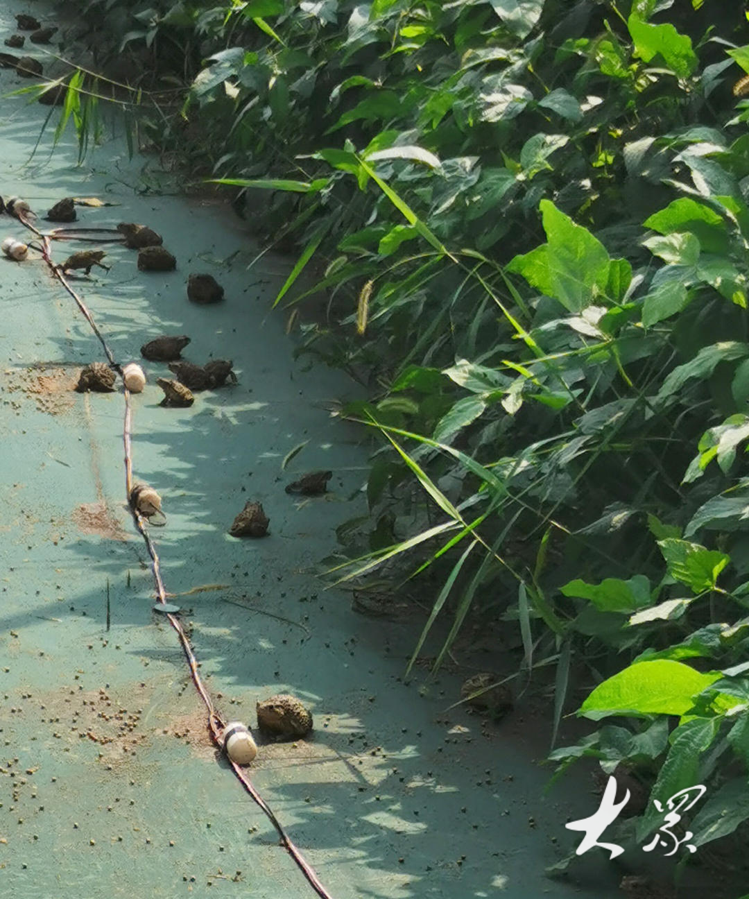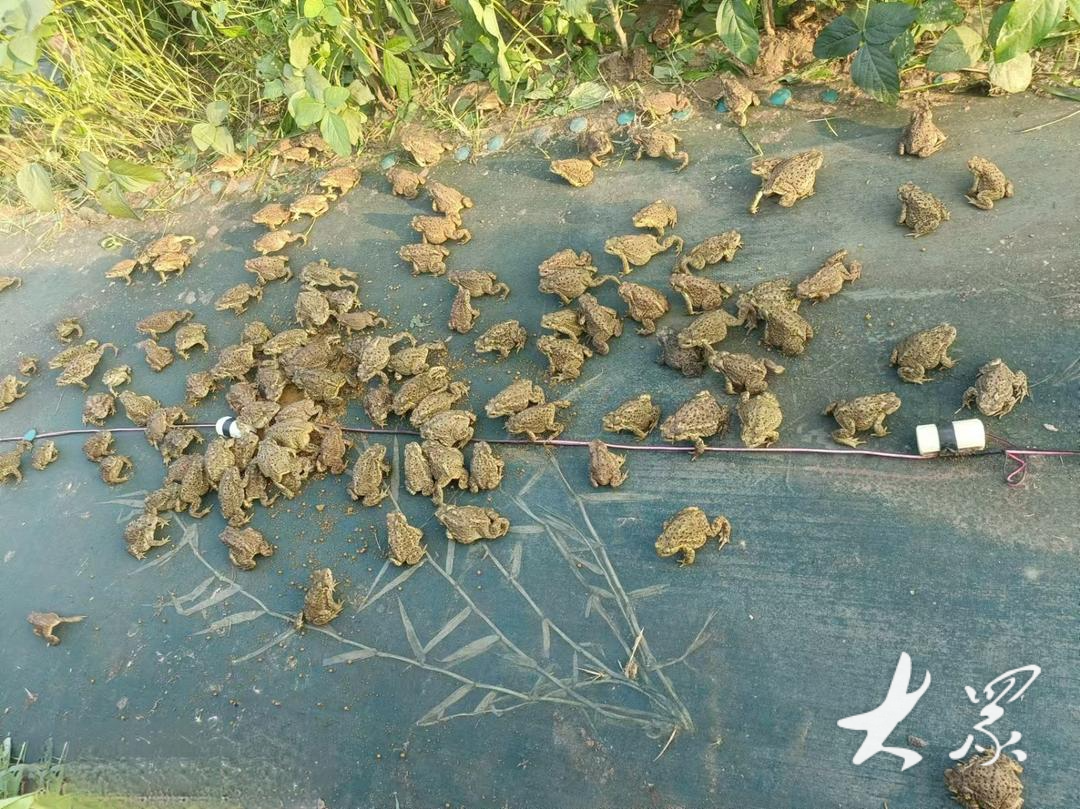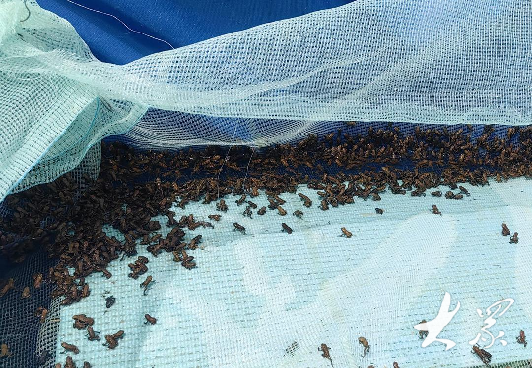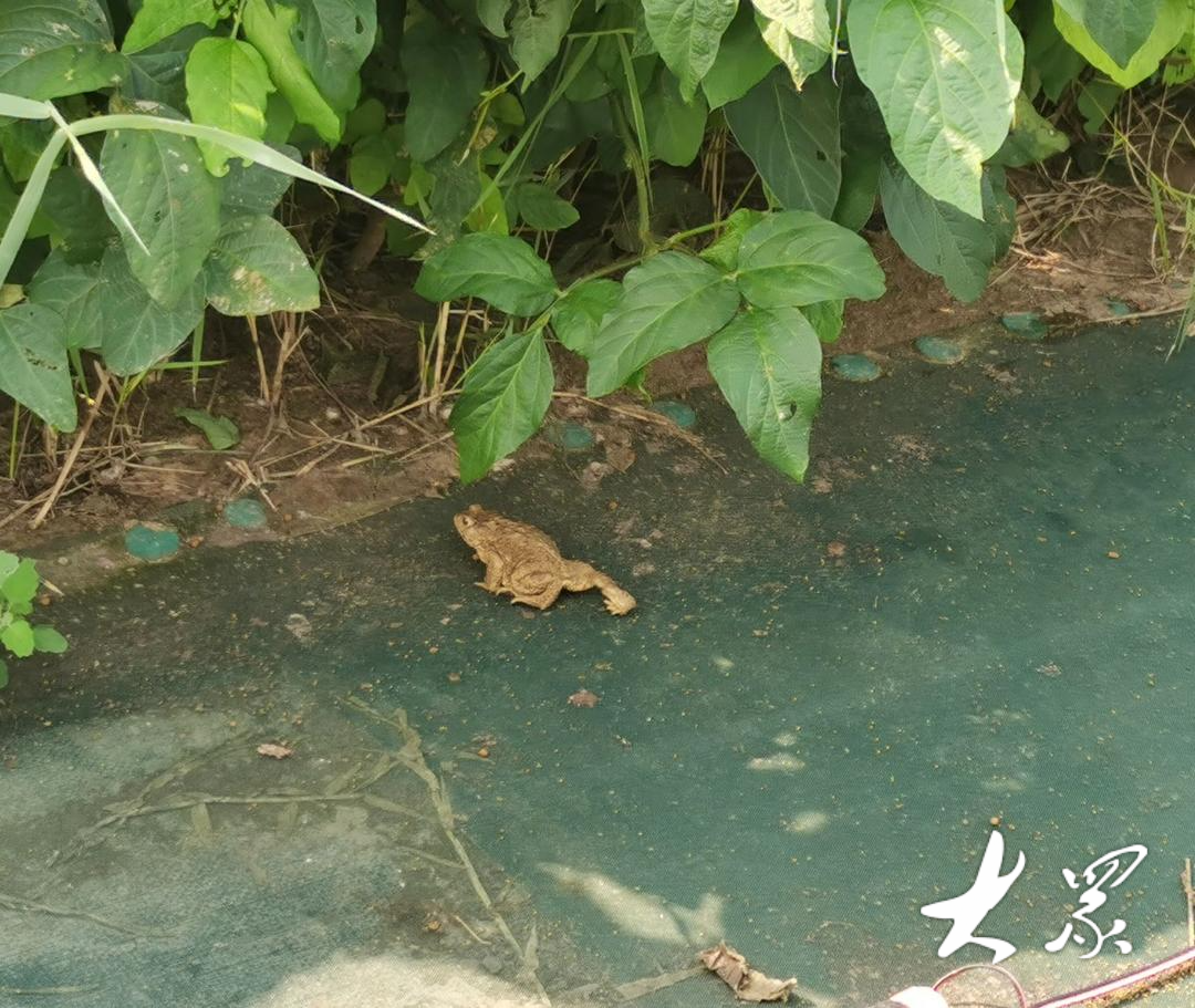 癞蛤蟆是两栖动物,能在陆地上生活,但皮肤表面要保持湿润。刚放进养殖池的小癞蛤蟆很怕晒,黄豆还没长起来,它们无处藏身,村民便给养殖池用上了遮阳网。春末夏初干旱,豆子地里两天浇一次水,确保小家伙们在舒适的地方健康成长。