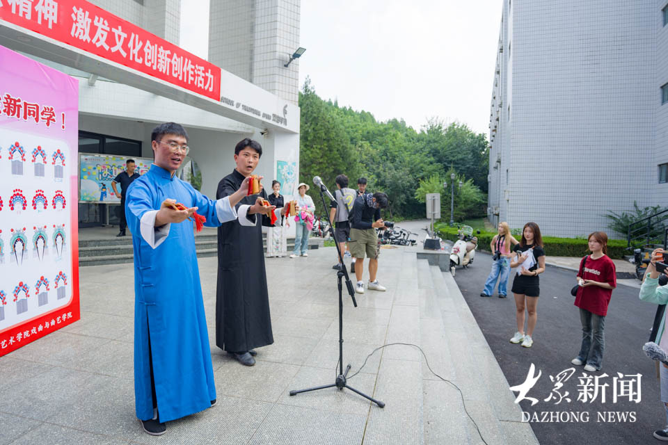 戏曲学院门前,2022级学生张文炳(左一)和2023级学生赵一(左二)为新生表演快板《泉水响叮咚》,向来自五湖四海的新生介绍泉城济南独特的泉水文化。