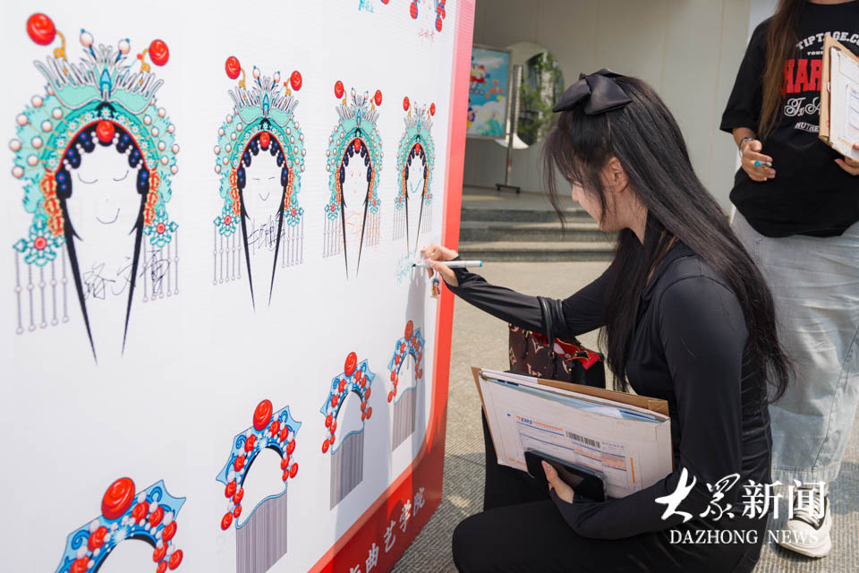 在戏曲学院,新生在融入戏曲艺术元素的签到展板上绘制表情,填写名字。