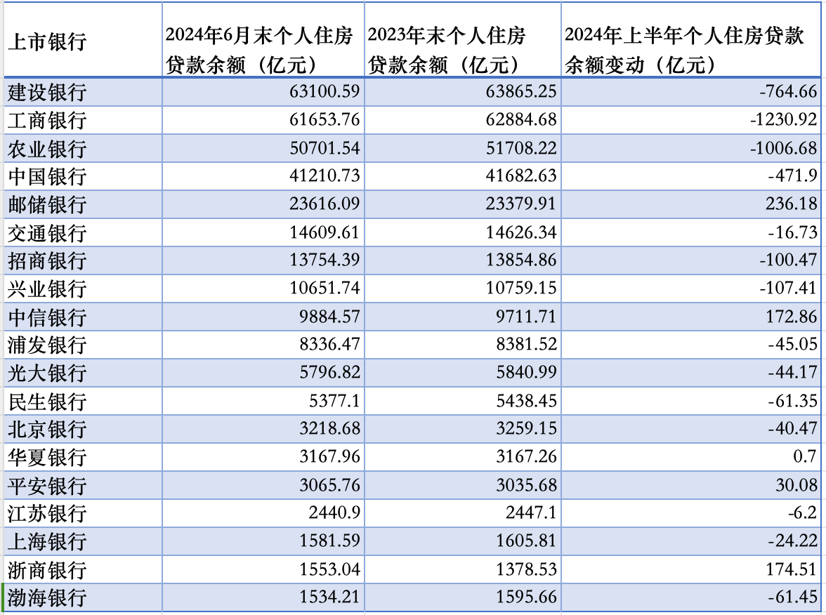 2024年上半年大中型银行个人住房贷款余额变动情况