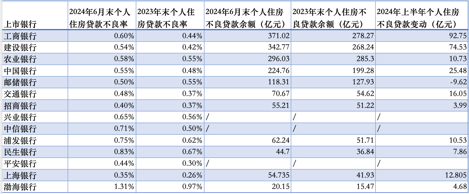 2024年上半年大中型银行个人住房贷款资产质量情况 “/”表示当期业绩报告未披露相关数据
