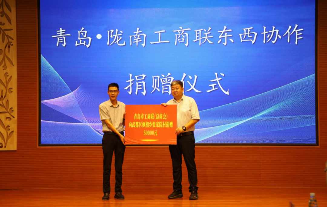 会上,举行了捐赠仪式。青岛市工商联(总商会)分别向武都区池坝乡池坝村、枫相乡张家院村各捐赠乡村建设资金5万元;双方企业代表和市招商局围绕深化两地交流交往,探索合作发展思路,企业资源对接等,进行了互动交流。