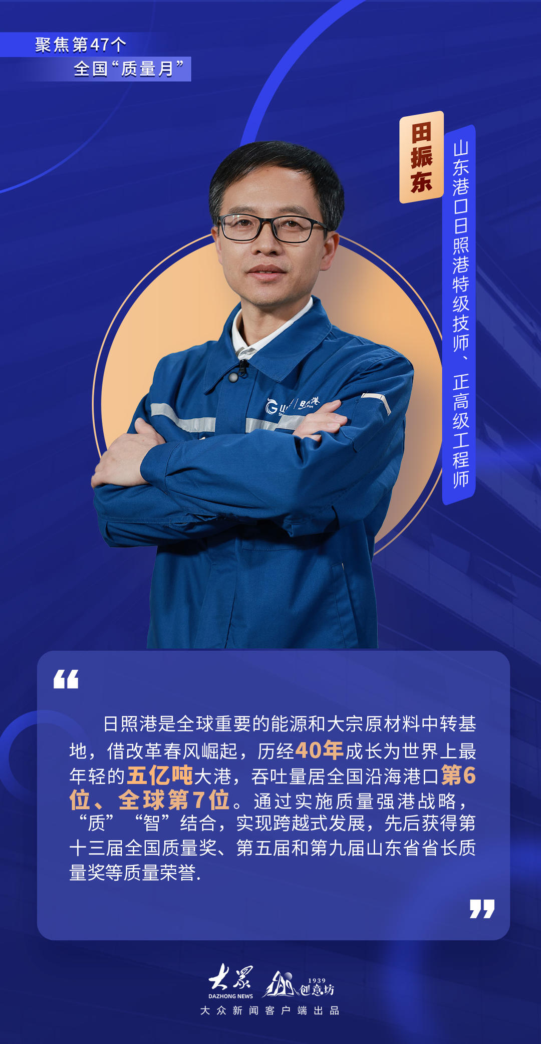 9月3日上午,在山东省2024年“质量月”活动启动仪式暨首席质量官典型经验报告会上,山东港口日照港特级技师、正高级工程师 田振东介绍了日照港质量强港战略的做法。