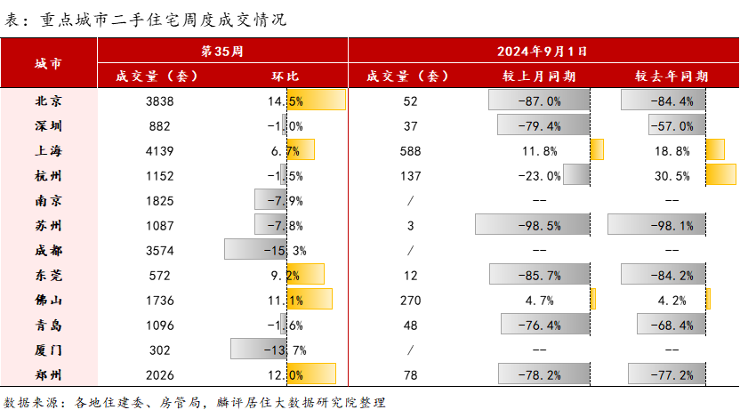 分城市来看,第35周有5城二手房成交量较上周上升,7城环比下跌。其中,北京二手房成交量环比涨幅领先,第35周成交3838套,较上周上涨14.5%,同时近期北京二手房成交持续保持一定热度,周度成交量环比已现“三连涨”;郑州、佛山位居环比涨幅第二、三,均较上周涨超10%。成都跌幅居首,较上周下降15.3%。