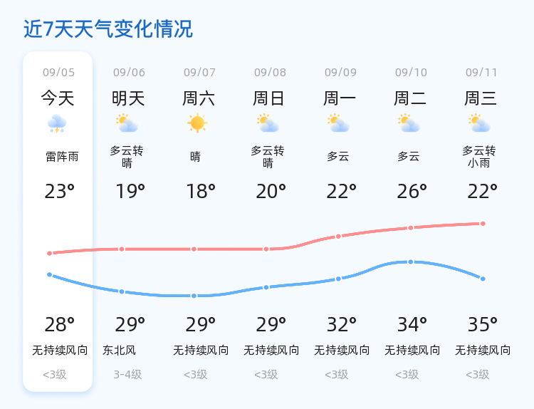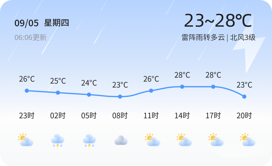 今天是2024年9月5日,农历八月初三,德州天气呈现雷阵雨转多云的格局,北风3级,温度范围在23℃至28℃之间。市区内各区均迎来雷阵雨,午后逐渐转为多云,市民出行需备好雨具,注意交通安全。