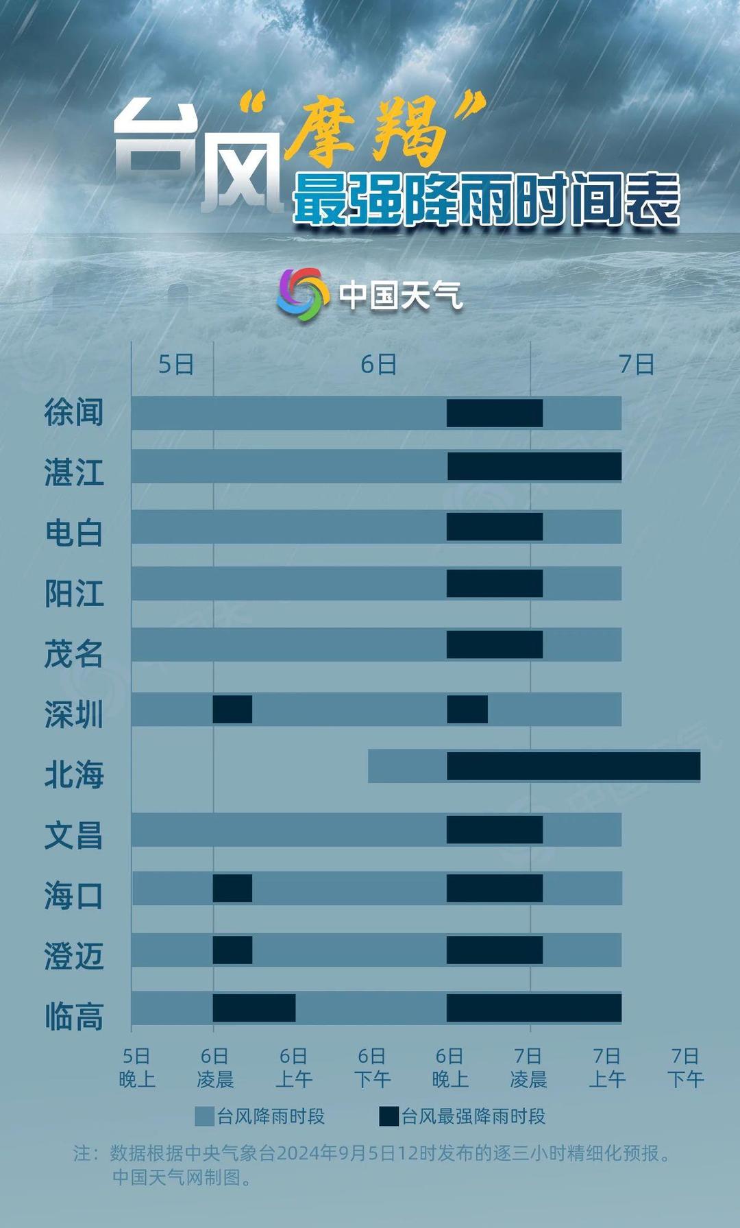 据中国天气网首席气象分析师信欣表示,今天白天到明天早晨将是“摩羯”对华南影响最为严重的时段。强降雨中心有两个,一个是台风登陆点附近,在海南岛东北角到雷州半岛东南部,另一个是台风前进的右侧,在广东茂名、阳江一带。