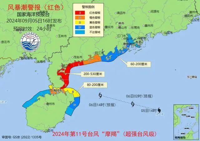 随着“摩羯”不断向沿海靠近,近岸浪高将逐渐增大,广东西部、海南北部沿海将有严重风暴潮过程,国家海洋预报台昨日(5日)下午将风暴潮预警级别升级为红色,并继续发布海浪红色警报。这也是今年第二个风暴潮海浪双红色预警。