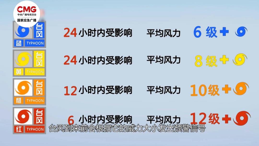 我国的台风预警信号分为四种。台风红色预警是指6小时内可能或者已经受热带气旋影响,沿海或者陆地平均风力达12级以上,或者阵风达14级以上并可能持续。此时需要更严格执行停止集会、停课、停业、人员躲避等防御工作。
