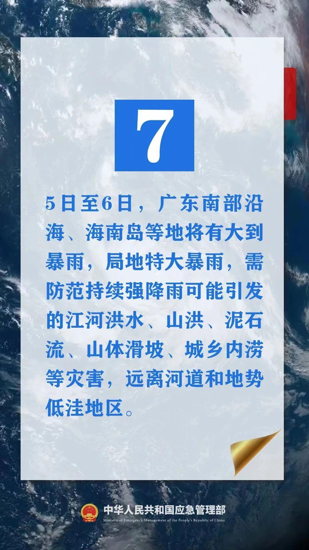 中央气象台预计,6日至8日,华南南部及云南南部有暴雨或大暴雨,其中海南岛、广东西南部、广西南部部分地区有特大暴雨;海南岛、广东、广西最强降雨时段在6日至7日,云南在7日夜间至8日雨势较强,部分地区有大暴雨或特大暴雨。