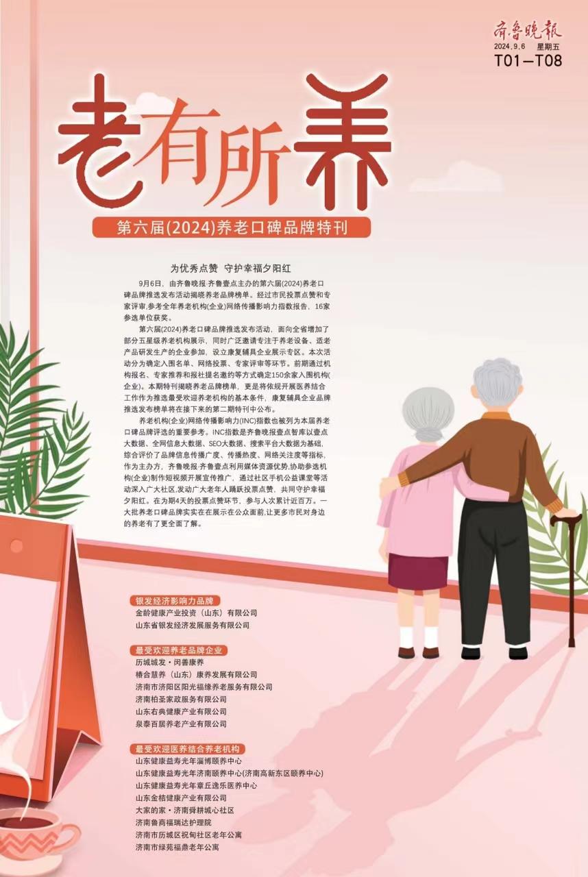 9月6日,由齐鲁晚报·齐鲁壹点主办的第六届(2024)养老口碑品牌推选发布活动揭晓养老品牌榜单。经过市民投票点赞和专家评审,参考全年养老机构(企业)网络传播影响力指数报告,16家参选单位获奖。