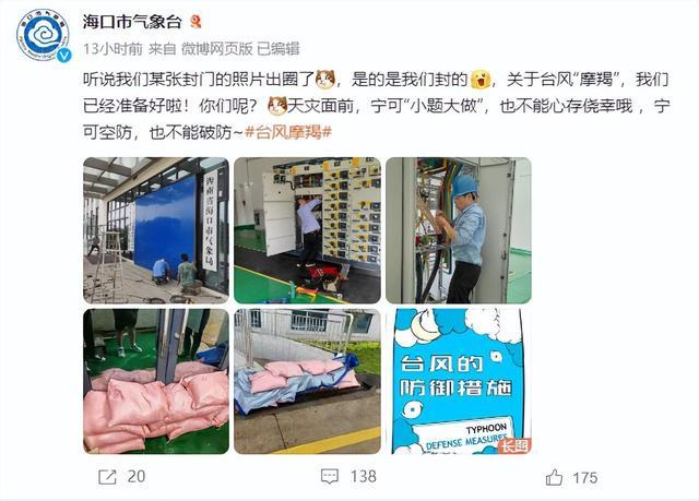 对此,海口气象局官博回应称:听说我们某张封门的照片出圈了,是的是我们封的,关于台风“摩羯”,我们已经准备好啦!你们呢?天灾面前,宁可“小题大做”,也不能心存侥幸哦 ,宁可空防,也不能破防。