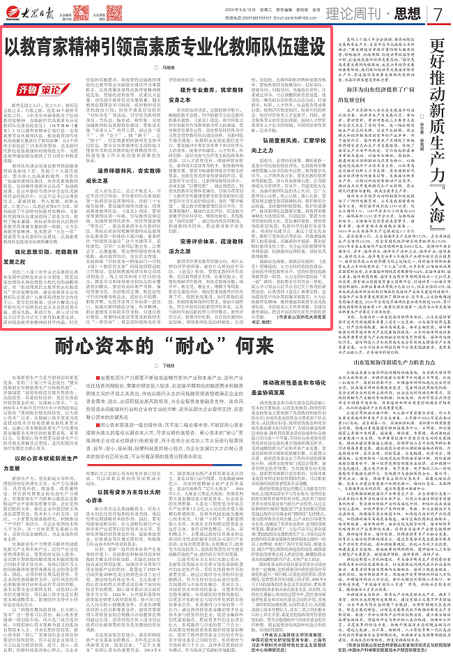 国将兴,必贵师而重傅。尊师重教一直是中华民族的优良传统,弘扬教育家精神需要融入办学治校全过程、教育教学各环节、人才培养各方面。要优化教师管理和资源配置,加大待遇保障力度,引导教师成长为有情怀、有水平、有温度的大先生,加强对教师队伍的关心关切,让广大教师安心从教、热心从教、静心从教。要更好建立健全各项保障机制,维护教师合法权益,支持教师积极管教,维护师道尊严,推动教师队伍健康发展,将教育家精神转化为思想自觉、行动自觉。要着力培育优质校园文化,营造尊师重教、爱校爱师的浓厚氛围,构建科学的教师荣誉体系,利用好关键节点,通过十佳先优表彰、教职工荣休仪式等活动,有效增强教职工的荣誉感、归属感和幸福感。要创新做好教师宣传工作,充分运用好新媒体等多种渠道,拓展教师宣传阵地,讲好优秀教师故事。