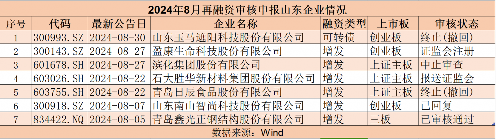 据Wind统计,8月,山东有7家企业更新再融资审核状态。南山智尚(300918.SZ)增发审核状态为已回复,鑫光正(834422.NQ)增发审核状态为已审核通过,石大胜华(603026.SH)增发审核状态为报送证监会,盈康生命(300143.审核状态为证监会注册,滨化股份(601678.审核状态为中止审查,日辰股份(603755.、玉马遮阳(300993.SZ)可转债审核状态为终止(撤回)。