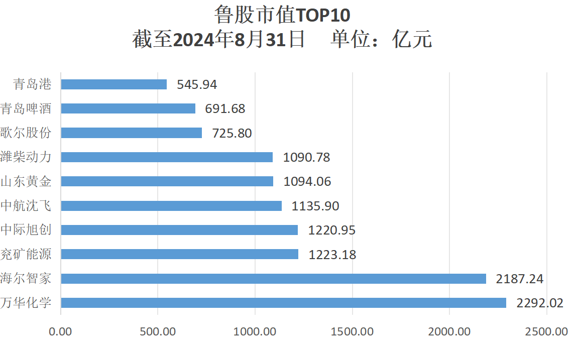 截至8月31日,山东市值排名前十的上市公司总市值为12207.54亿元,总市值过千亿的有7家。