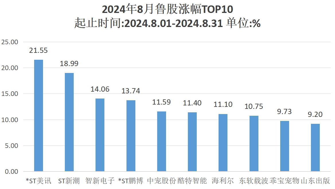 8月,鲁股月度区间涨幅最大的是*ST美讯(600898.SH),区间涨幅为21.55%;紧随其后的是ST新潮(600777.SH),涨幅为18.99%;此外,智新电子(837212.BJ)、*ST鹏博(600804.也超过12%。