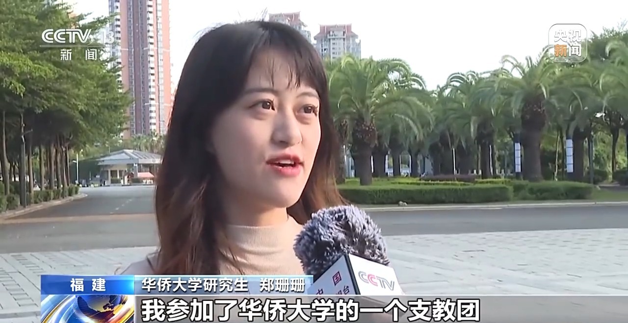 华侨大学研究生 郑珊珊:我小学的一位支教老师,因为我家是农村的,其实她是怀孕着来的,她坚守到最后一刻,告诉我们说,不要怕万人阻挡,就怕自己投降。也是在她的影响下,我参加了华侨大学的一个支教团。