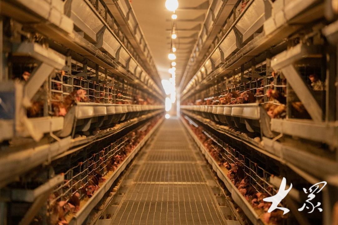 在这里,鸡舍内的温度、湿度、空气质量状况等,都由电脑环境控制系统进行自动检测、调节,鸡粪不落地,由机器定时清理,保证鸡舍内良好的卫生环境。