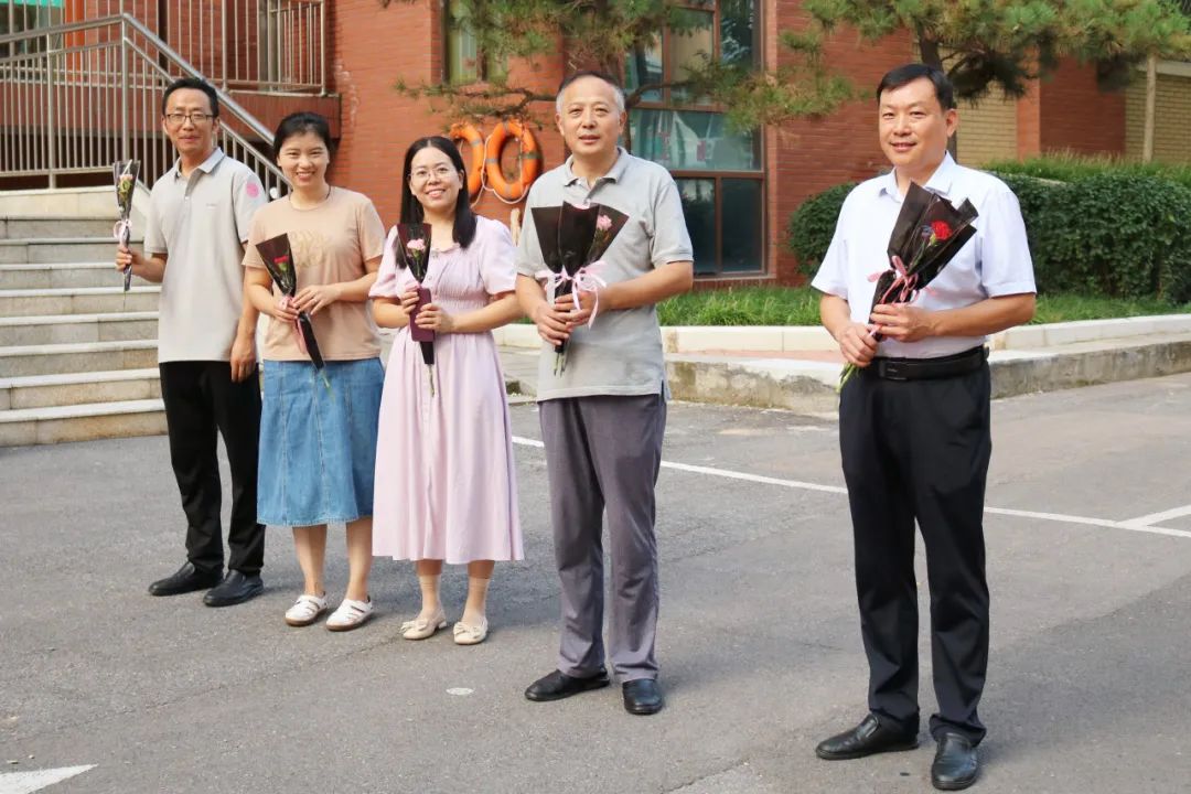9月10日清晨,校领导早早地守候在校门口,准备给老师们送上一份惊喜。他们准备了鲜花、笑脸、祝福,还用全体教师的名字组成了一个大大的“师”字。合影墙前,老师们留下了灿烂的笑脸。同时,同学们也为老师们制作了精美的贺卡,表达了对老师的感谢和祝福。