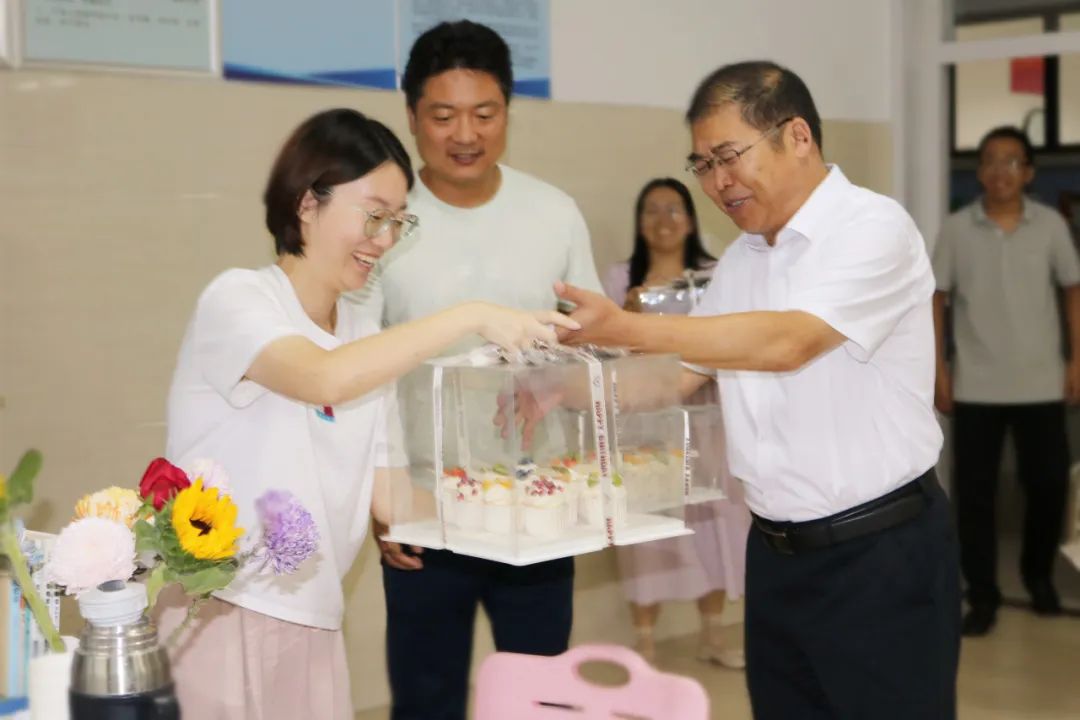 音乐教师亓叶丽还带来了歌曲表演《和谐圆舞曲》。随后,校领导团队为全体教师送上一份节日蛋糕,每一个蛋糕上都有老师的名字,充满了仪式感。