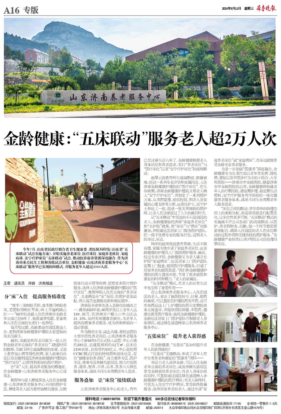 今年7月,山东省民政厅联合省卫生健康委、省医保局印发《山东省“五床联动”试点实施方案》,开始实施养老床位、医疗床位、家庭养老床位、家庭病床、安宁疗护床位“五床联动”试点,推动医养康养资源深度融合。作为济南市重点民生工程和首批试点单位,金龄健康•山东济南养老服务中心“五床联动”服务早已实现闭环模式,并服务老年人超过20000人次。
