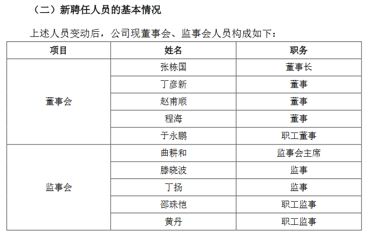 根据披露内容,董事会、监事会人员变动后,公司董事长仍为张栋国,程海成为公司新任董事(此前为职工董事),于永鹏为新任职工董事(此前为监事会主席),曲耕和为新任监事会主席,丁扬为新任监事,邵珠恺为新任职工监事。