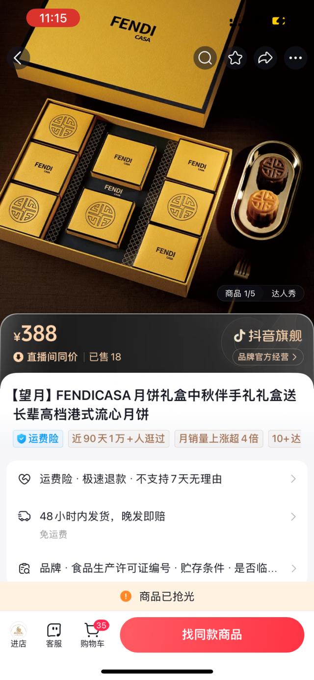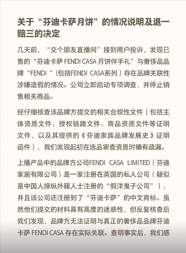 “交个朋友直播间”称,接到用户投诉,发现已售的“芬迪卡萨 FENDI CASA 月饼伴手礼”与奢侈品品牌“FENDI”(包括 FENDI CASA 系列)存在品牌关联性涉嫌造假的情况。公司立即启动专项调查,并停止销售相关商品。