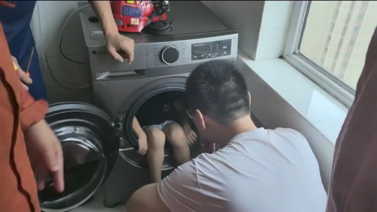 救援人员到达现场后发现,1名3岁半男童钻进洗衣机内导致被卡,经检查儿童无生命危险,随即展开救援。