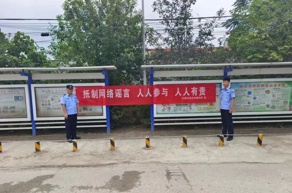活动现场,民辅警发放打击整治网络谣言宣传单页,通过阅读倡议书内容,并将打谣宣传条幅悬挂贴在校园醒目位置,让每一位教职员工都能切实感受到打击网络谣言的紧迫性与重要性,时刻提醒着教职员工关注网络谣言问题。