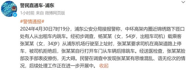 4月30日,上海市公安局浦东分局通报:2024年4月30日7时19分,浦东公安分局接报警称,中环高架内圈近锦绣路下匝口处有人从出租车内跳车。