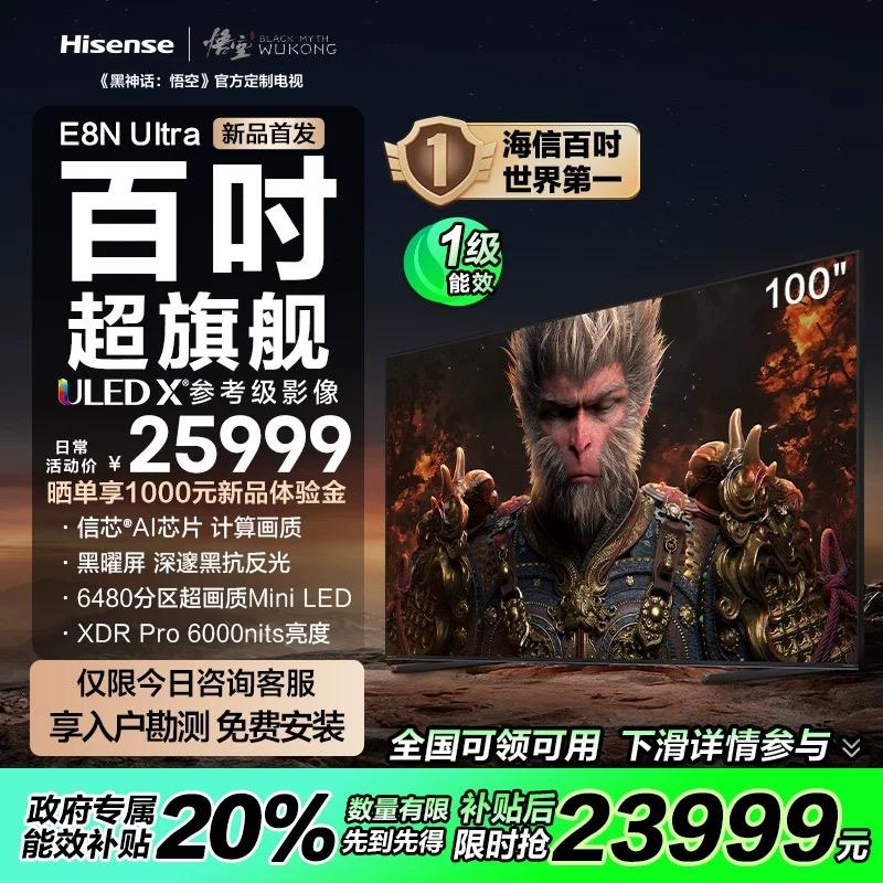 在以旧换新产品类目中,海信与《黑神话:悟空》官方定制电视百吋E8系列,不仅尺寸更大,配置参数也同样拉满。就拿被称为“百吋超旗舰Mini LED”的海信100E8NUltra来说,其搭载的信芯®AI画质芯片堪称电视上的“独立显卡”,能够针对性精细画质调校,实现瞬时精晰控光,即便是最细微的纹理、最复杂的色彩过渡,也能被精准还原。硬件用好料,画质重调校,海信100E8NUltra将画质体验做到了极致,是当之不愧的画质专家。