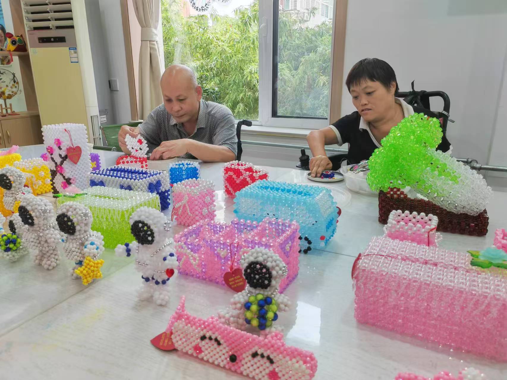 9月12日下午,在奎文区东关街道苇湾社区“天使助残创业手工坊”内,残障人士肖岚和两名同伴正在进行手工串珠制作,桌子上则摆满了他们制作完成的纸巾盒、玩偶等作品。“社区提供场所、培训,我们残障人士可以靠自己赚钱,现在销售情况很好,我们最近还想上线抖音直播。”肖岚说。