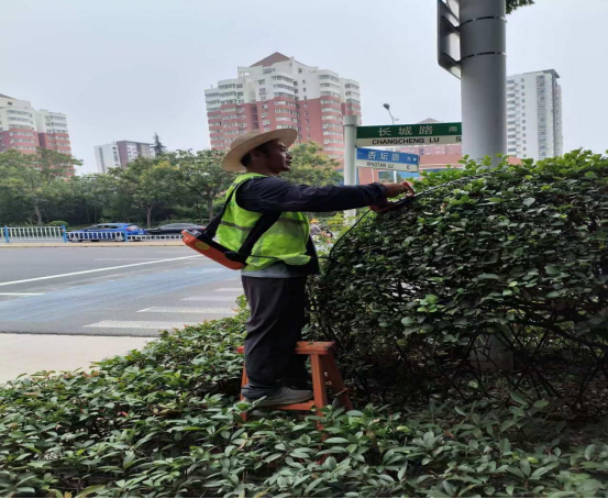 常态修剪,提升绿地颜值。坚持“及时、整齐、美观”的原则,对模纹、球类及绿篱等苗木进行精细化修剪,同时对影响道路交通、遮挡路灯及标识的苗木进行全面排查并修剪,以疏枝整形为主,使水分养分集中,减少消耗,促进植物正常生长,提升城市绿化景观效果。