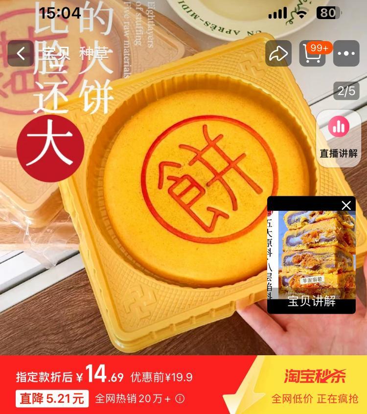 其他商家嗅到商机,纷纷加入大月饼赛道。很快,这种尺寸大、分量足、包装朴素且价格实惠的大月饼出现在了各大商超及电商平台。在电商平台搜索,可以看到某款售价十几元的大月饼销量达到了20余万。