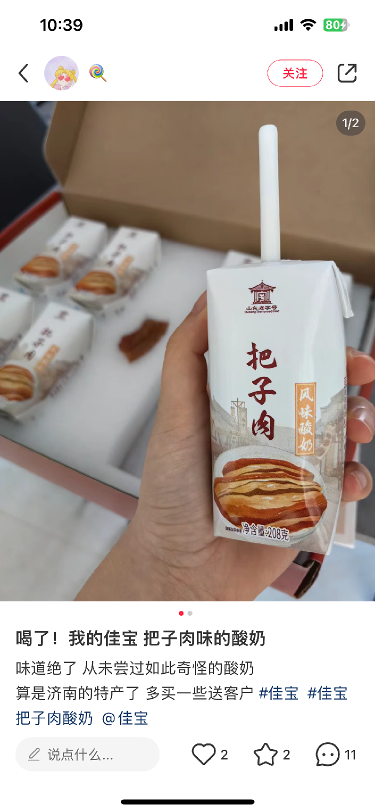 例如,随着把子肉酸奶、煎饼果子牛奶、胡辣汤月饼等跨界美食在社交平台走红,不少网友选择了购买“当地跨界王”送朋友。在小红书,就有网友分享自己购买了一箱近日大火的把子肉酸奶,称“年轻人有自己的送礼臻品”,也有网友将其当作济南特产送客户。