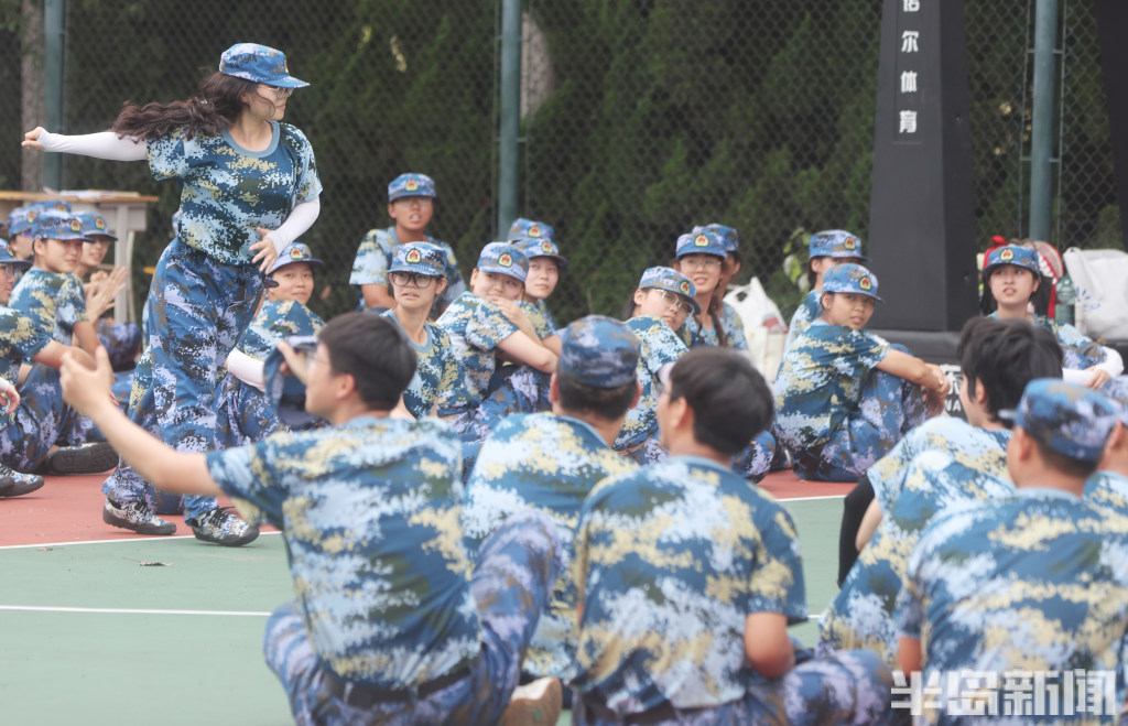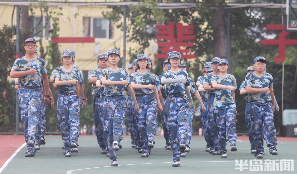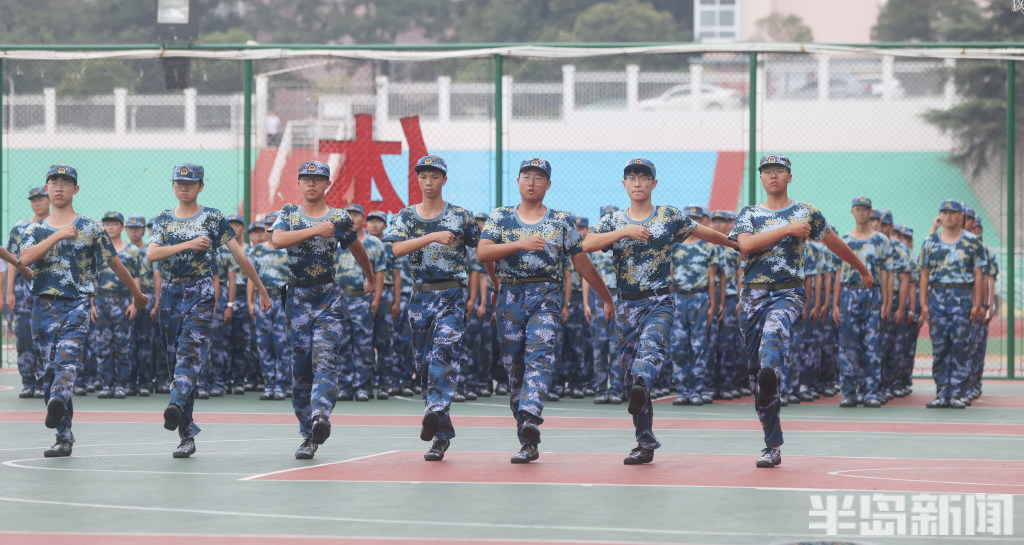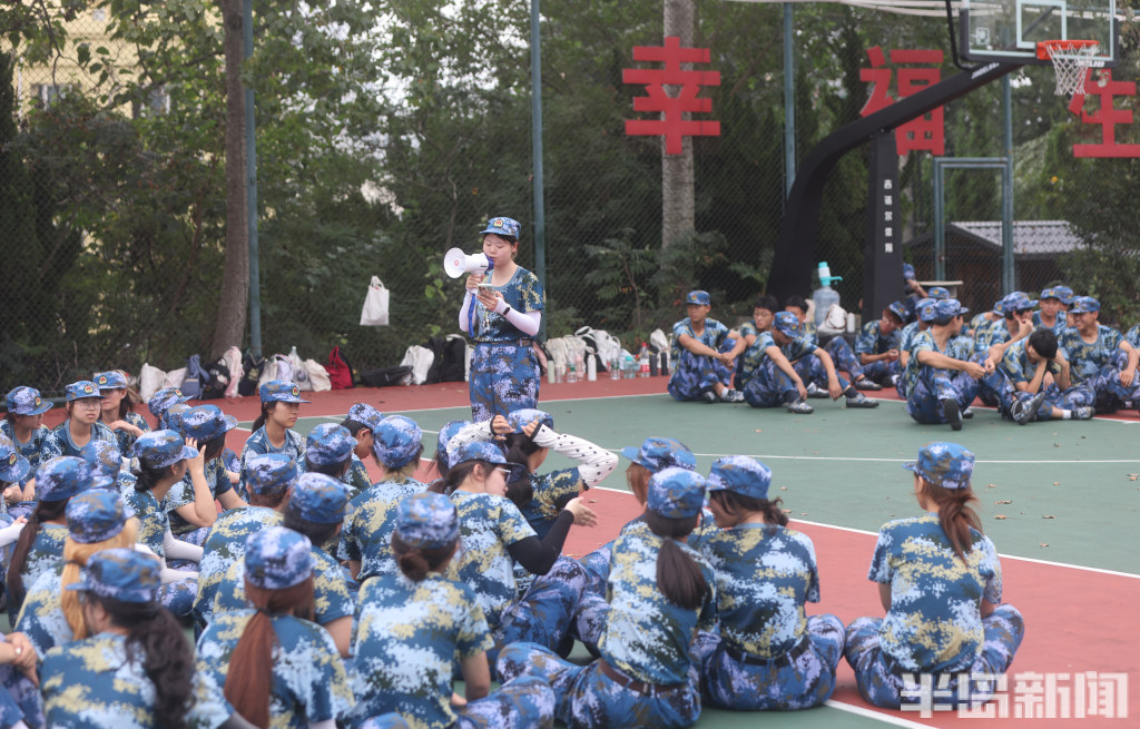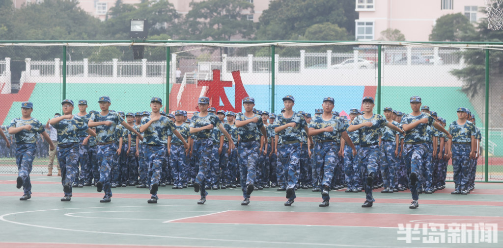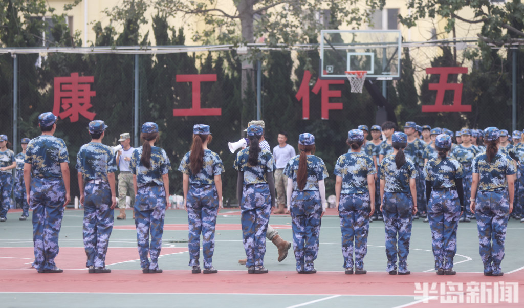 9月14日,青岛科技大学崂山校区篮球场上,大一新生正在军训中,他们在教官的指挥下练习列队、军姿、齐步、正步等。据了解,9月20日上午,他们将举行军训成果汇报展示。