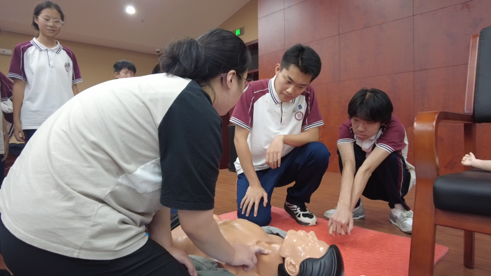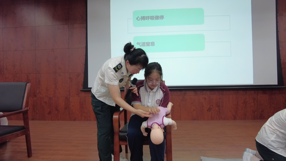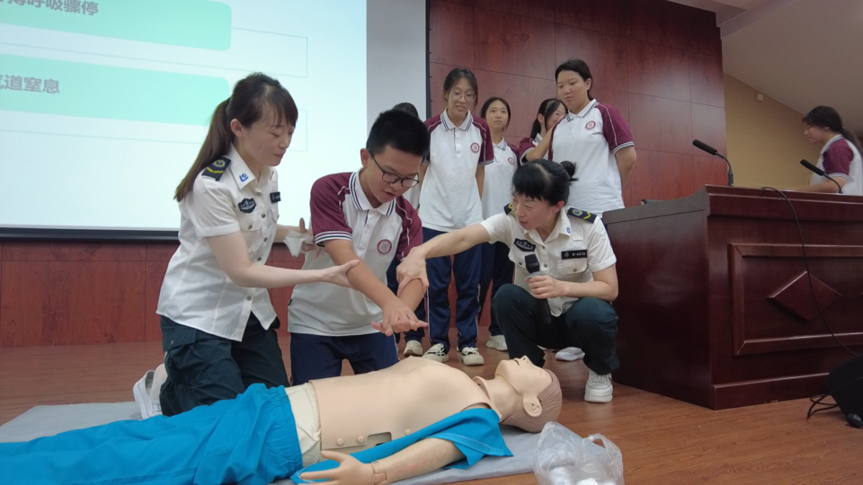 活动现场,市急救指挥中心主任边霞表示,在突发紧急情况时,掌握一定的急救知识和技能,能够挽救生命,减轻伤害,为生命争取更多的抢救时间。随后,市人民医院急诊科护士长李艳花为在场师生详细讲解了骨折、烫伤、胸痛等校园常见卫生健康问题常识以及心肺复苏、海姆立克法、AED使用、骨折简单固定等急救专业知识。