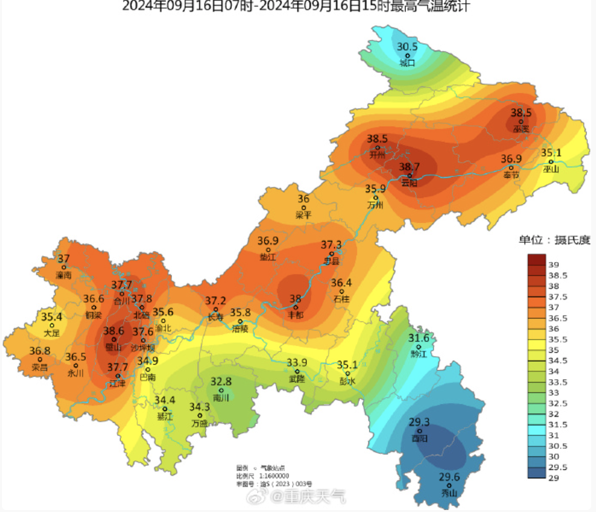 重庆发布高温橙色预警信号。预计16日14:00-19:00,渝中、沙坪坝、大渡口、江北、九龙坡、南岸、两江新区、高新区、渝北、北碚、巴南、潼南、合川、大足、铜梁、璧山、荣昌、永川、江津、綦江、万盛经开区、长寿、垫江、涪陵、丰都、忠县、梁平、万州、开州、云阳、奉节、巫溪、巫山、武隆、石柱等35个区县,日最高气温将升至37℃以上,局地可达40℃。