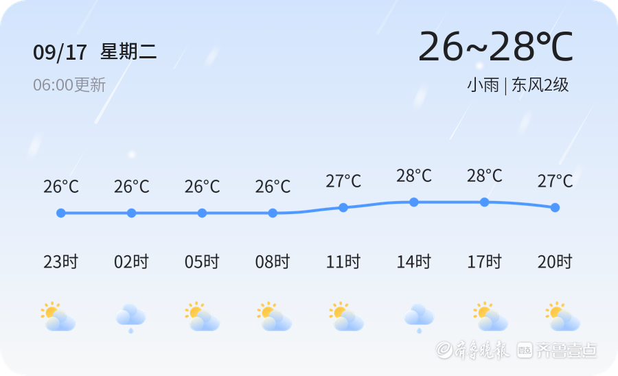 【青岛今日天气】2024年9月17日,农历八月十五,青岛迎来小雨天气,当前气温26.1℃,东风2级,空气湿度高达94%,空气质量优(PM2.5浓度为25微克/立方米),适合开窗通风。小雨淅沥,给市民出行带来不便,建议携带雨具,注意行车安全,保持车速稳定,确保行车安全。