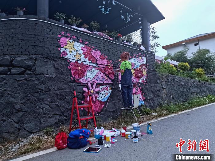 9月13日,年轻人正在乡村街道边创作彩绘。杨英琦 摄