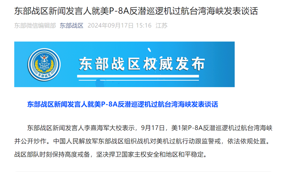 据东部战区微信公众号9月17日消息,东部战区新闻发言人就美P-8A反潜巡逻机过航台湾海峡发表谈话。