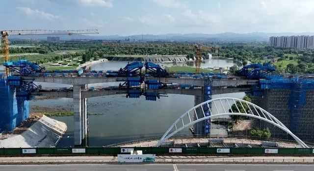 跨绣源河悬浇梁桥位于经十东路鹅庄大桥南侧,主墩由6个T型结构组成,上部结构悬浇梁共配备12套挂篮同时进行施工,建成后可供列车上行、下行和进出车辆段。